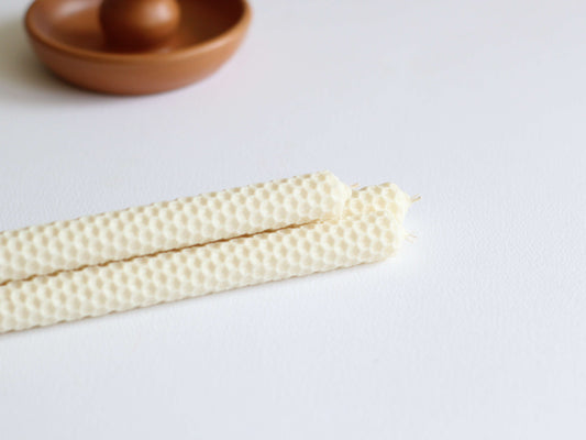 Set trei lumânari din ceară de albine și suport Teracota tip sfeșnic - lumânări albe