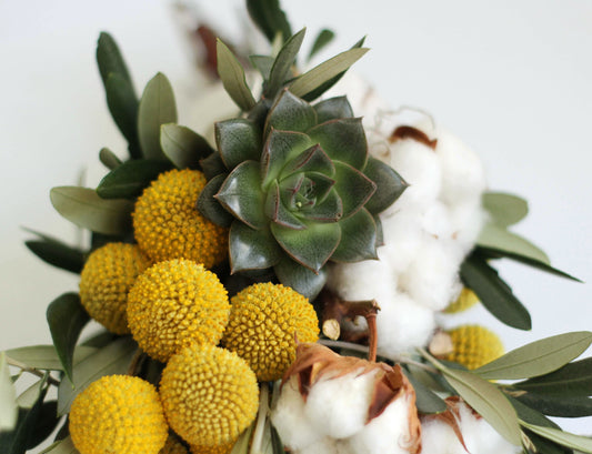 Stoc epuizatBuchet cu măslin, craspedia, suculentă și bumbac